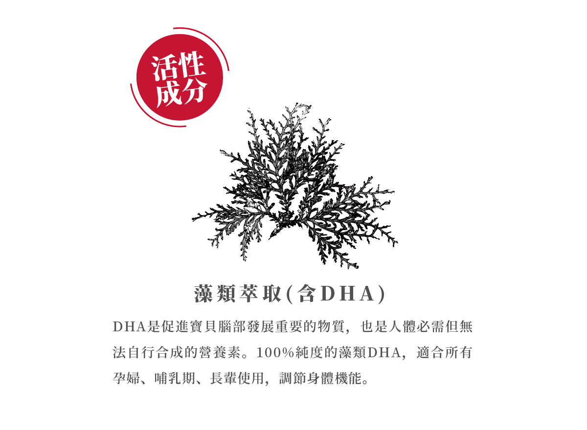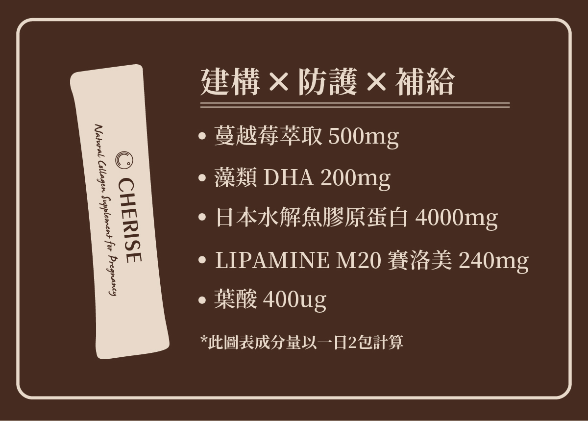魚膠原蛋白(含魚膠原蛋白胜肽)、超級葉酸、藻類萃取(含DHA)、姬菇萃取(含Ceramide)、蔓越莓萃取、DHA藻油、卵磷脂、草莓果汁粉、優酪粉。