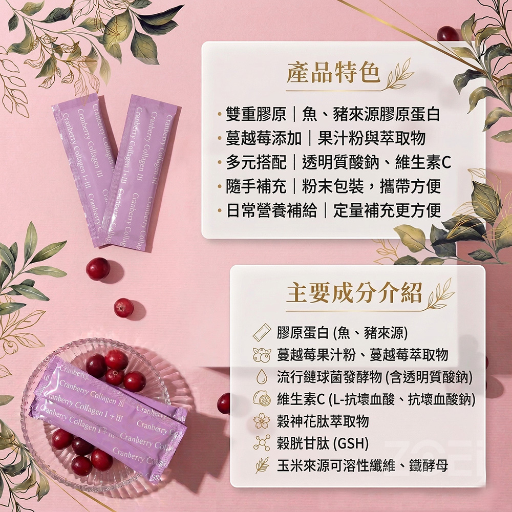 雙重膠原結合蔓越莓精萃,打造每日補給新習慣。