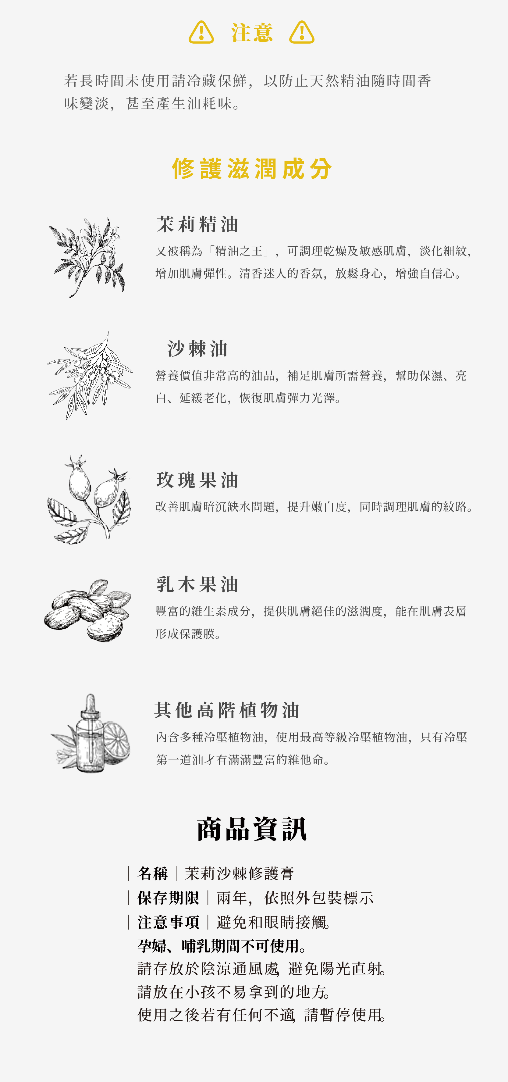 • 請冷藏保存,避免陽光直射與高溫環境,防止天然精油變質。