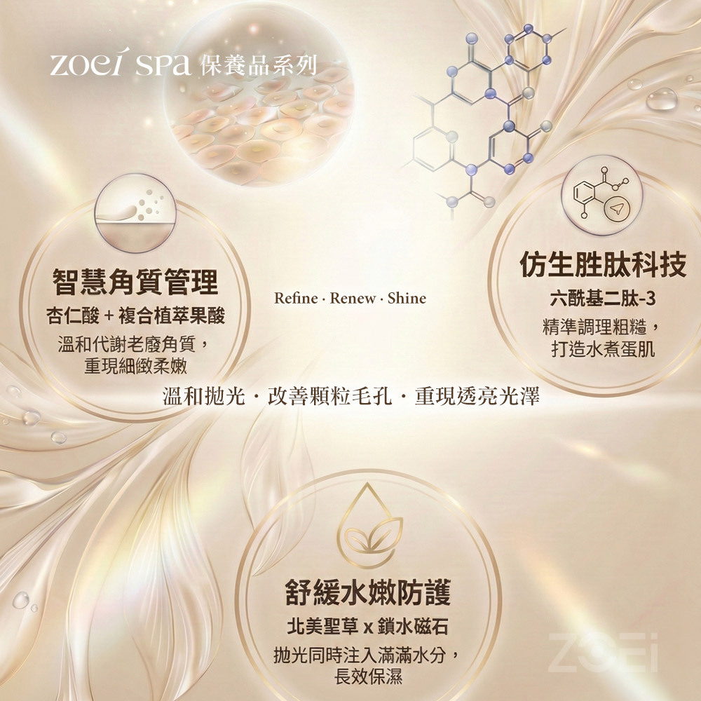 溫和拋光、改善粗糙顆粒、疏通毛孔、重現透亮光澤。