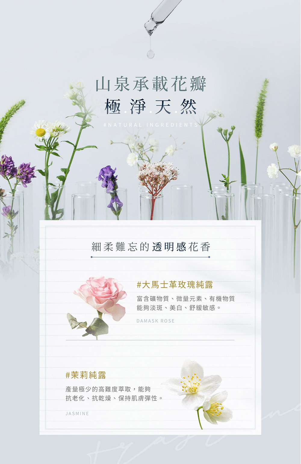 選用大馬士革玫瑰與茉莉純露,細緻滲透乾燥肌膚,為肌膚注入清新潤澤。