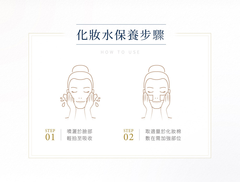 每天早晚清潔臉部後,均勻噴灑於全臉,不需等乾即可進行後續步驟。