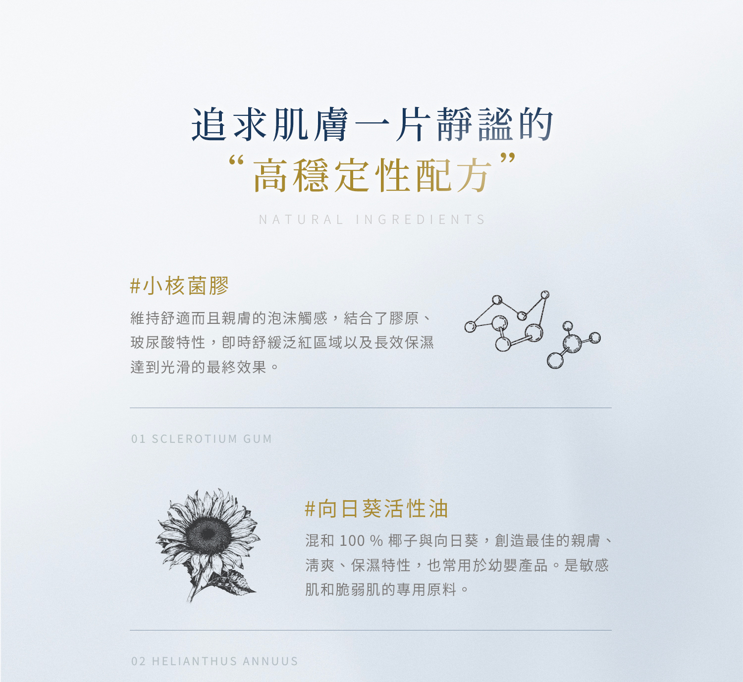 為敏感、脆弱肌膚量身打造的溫柔配方,用最親膚的植物修護力,洗去一天的疲憊。