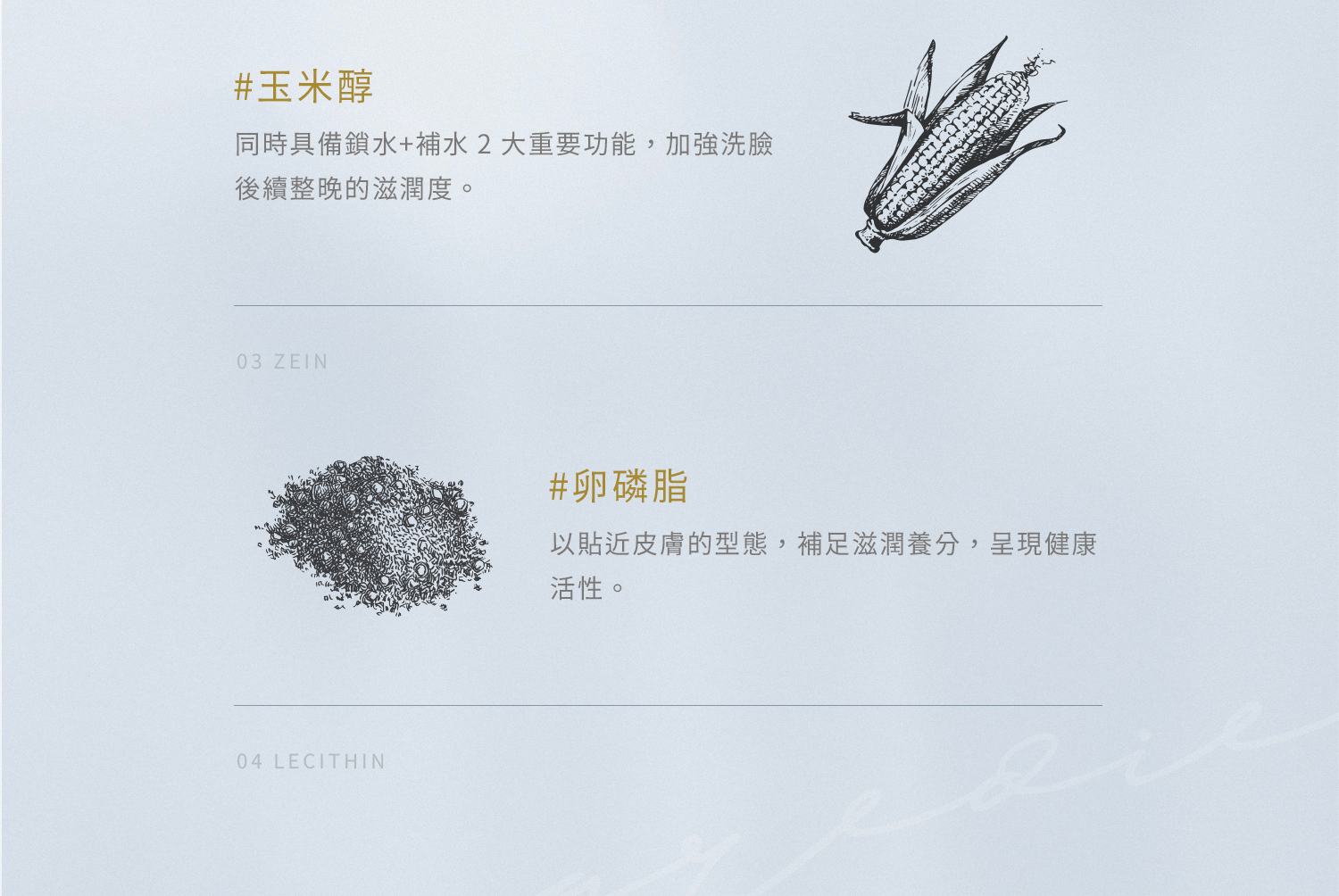 玫瑰精油、茉莉精油、天然月桂潔淨成分、小核菌膠、白夏菊萃取、野玫菜發酵萃物、向日葵活性油、玉米醇。