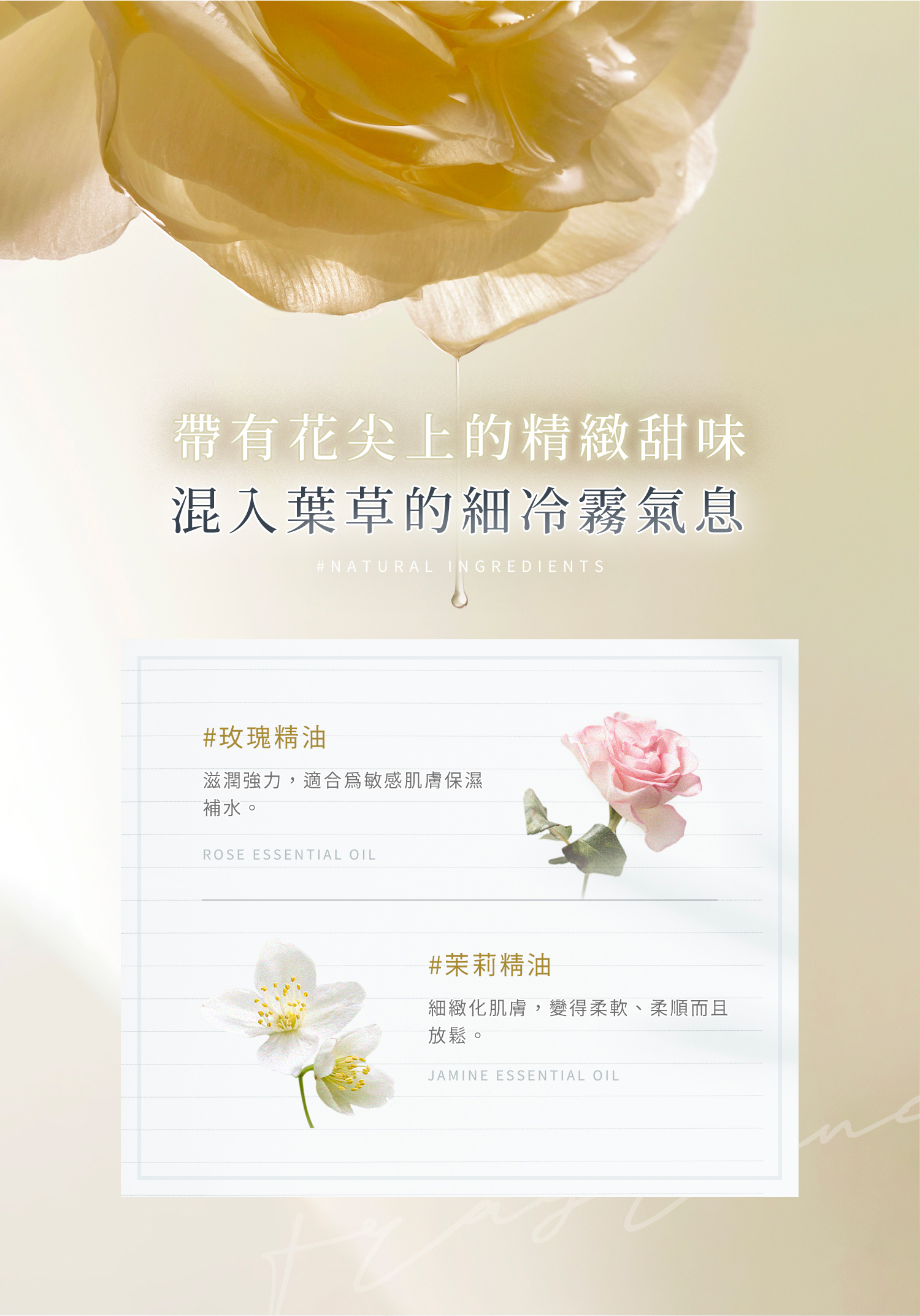 結合玫瑰與茉莉精油,搭配花草萃取物,溫和淨化毛孔、深層補水、細緻膚質,讓肌膚宛如花瓣般柔嫩透亮。