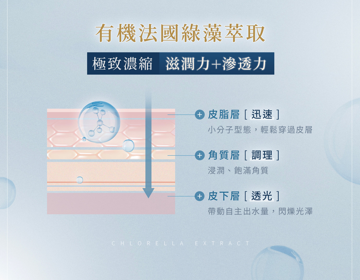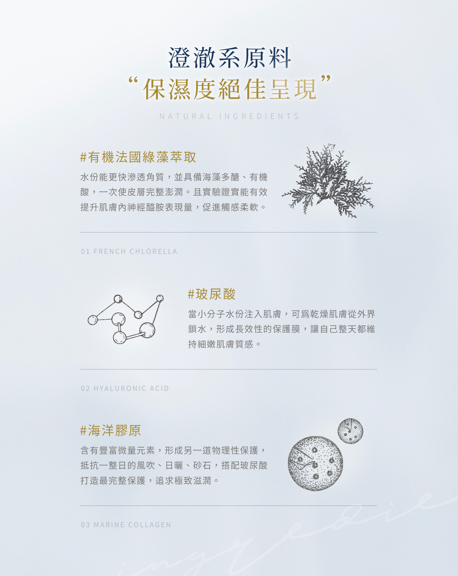 有機法國綠藻萃取、玻尿酸、海洋膠原、厚朴精油、玫瑰精油、茉莉精油。