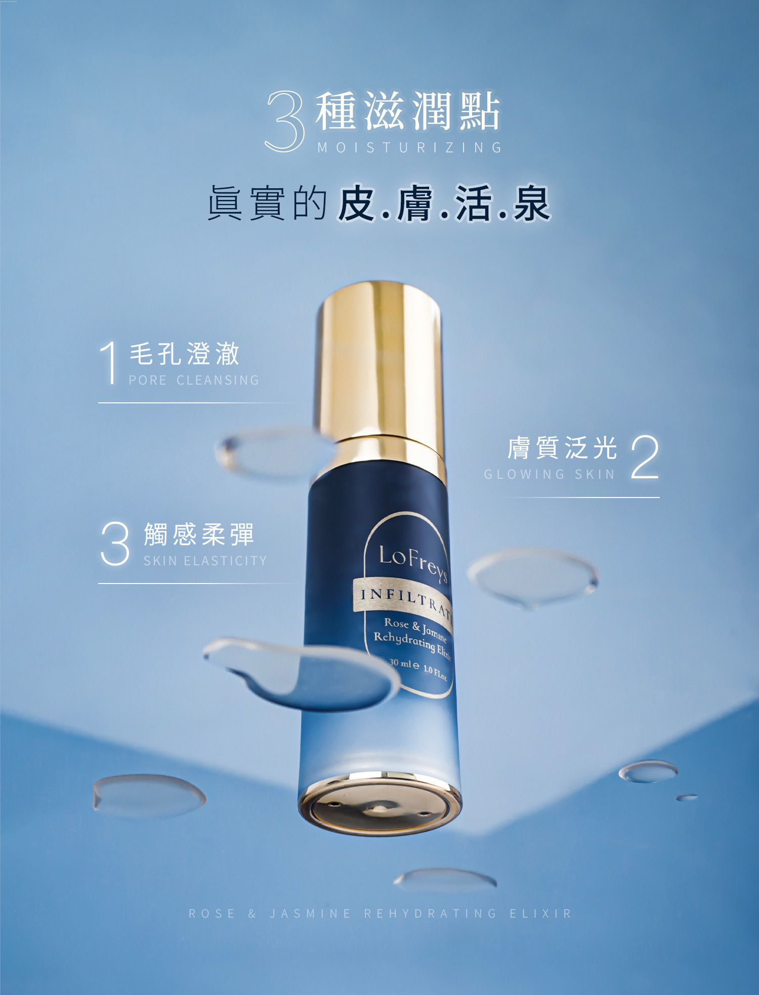 嚴選有機法國玫瑰、茉莉精華,搭配玻尿酸、海洋膠原與厚朴精油,為肌膚注入深層水分,提升保水力與光澤感,讓肌膚持續柔嫩透亮。
