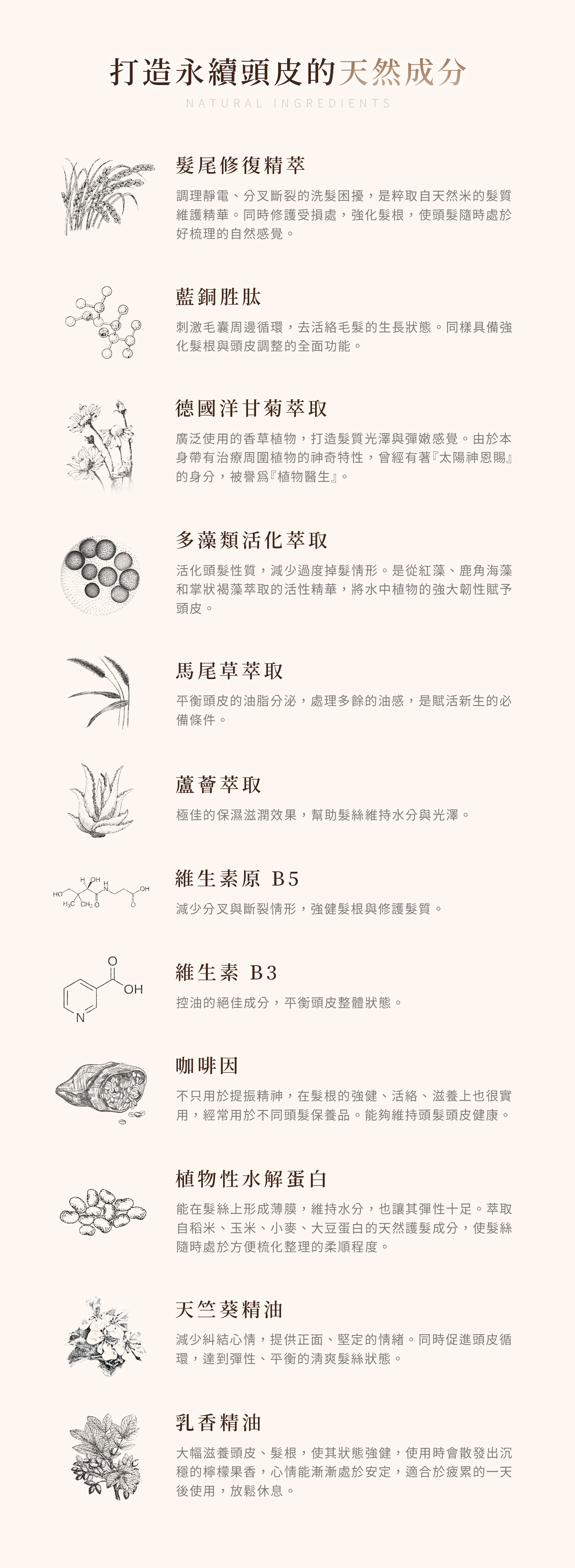 結構蛋白胺基酸、紅藻活化萃取、鹿角海藻萃取、髮尾修復精華、馬尾草萃取、德國洋甘菊萃取、藍銅胜肽、維生素原B5、維生素B3、乳香精油、天竺葵精油。
