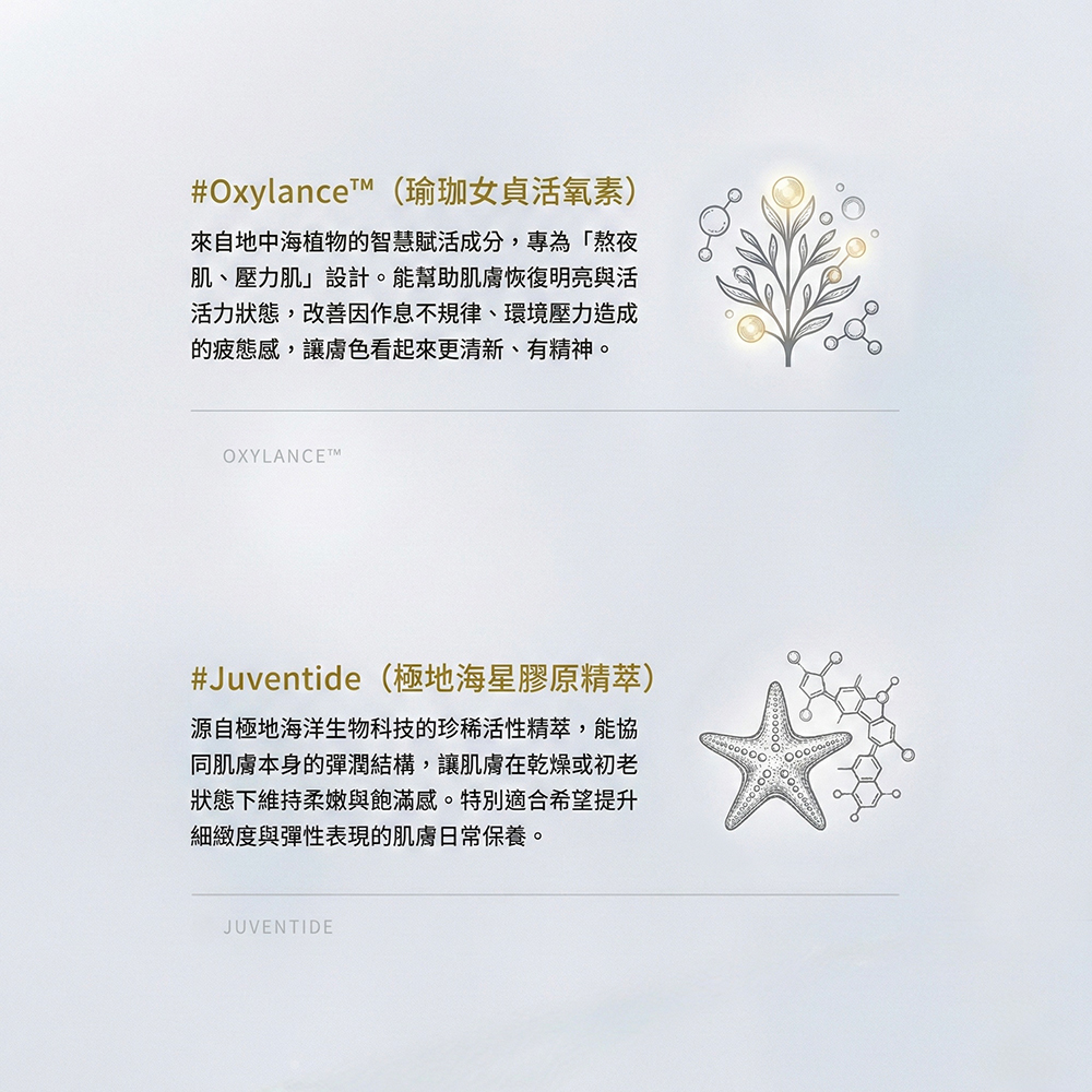 來自地中海植物的賦活成分,特別為熬夜、壓力與作息不穩定肌膚設計,能幫助肌膚恢復明亮感與精神感,讓膚色看起來更清新、有活力。