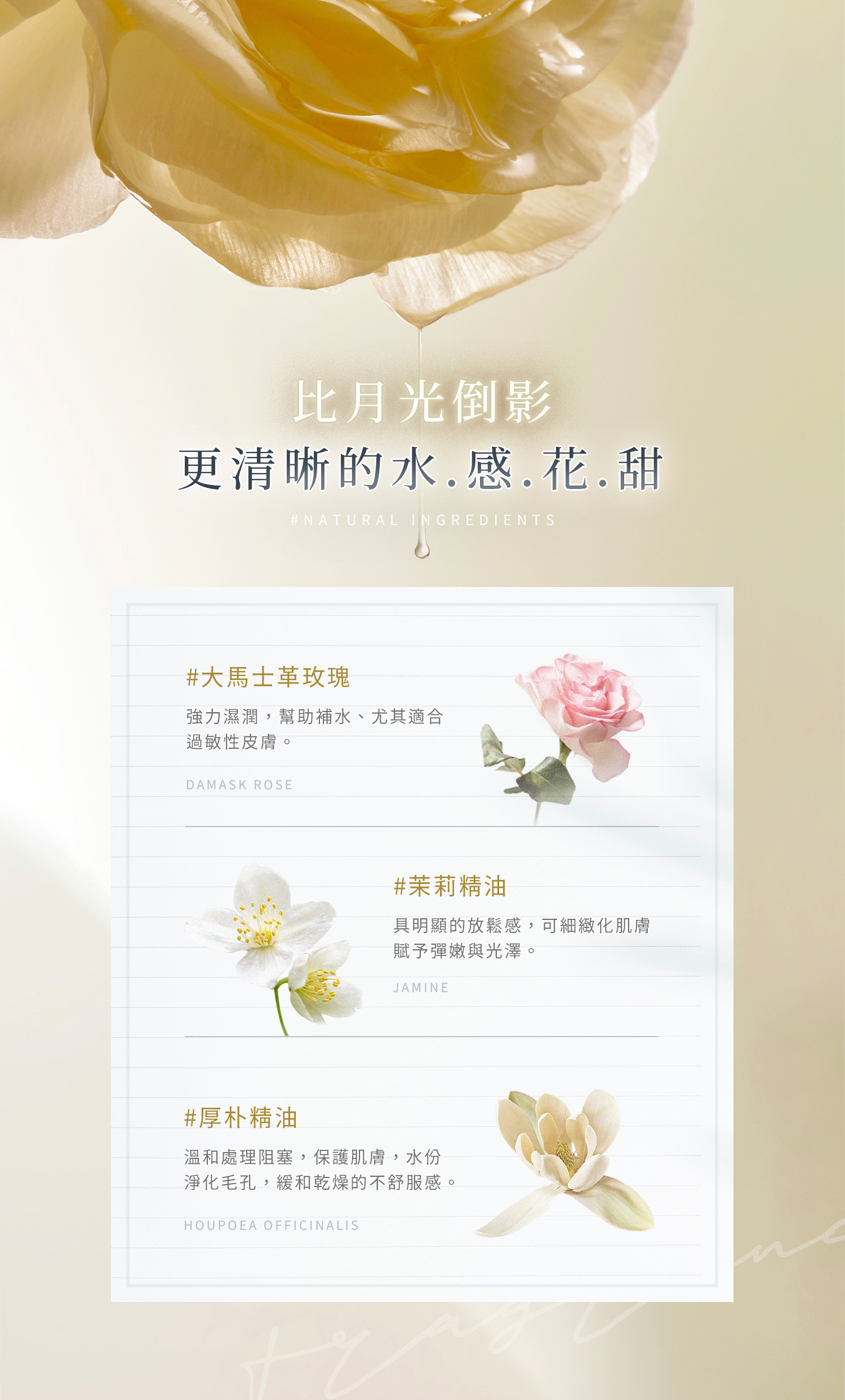 嚴選有機法國玫瑰、茉莉精華,搭配玻尿酸、海洋膠原與厚朴精油,為肌膚注入深層水分,提升保水力與光澤感,讓肌膚持續柔嫩透亮。