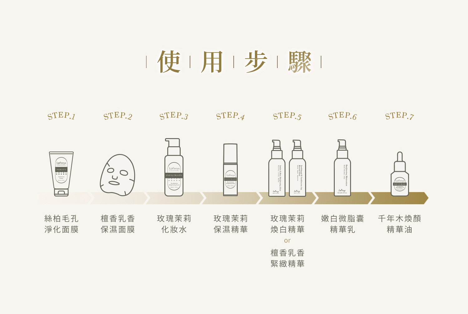 每天早晚清潔臉部後,取三滴輕點於全臉,以指腹輕柔按摩。不需等乾即可進行後續步驟。
