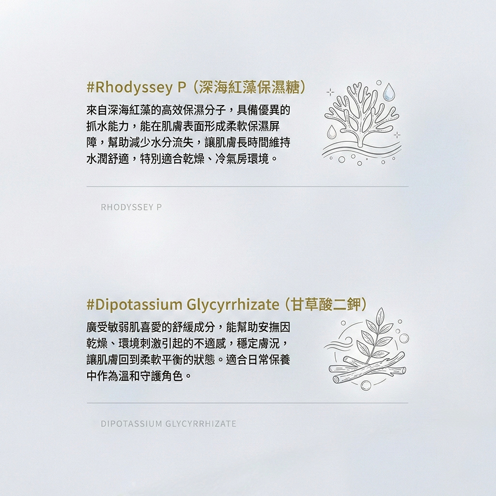 來自深海紅藻的保濕分子,能抓住水分並在肌膚表層形成柔軟保護層,減少水分流失,讓肌膚長時間維持水潤舒適狀態。