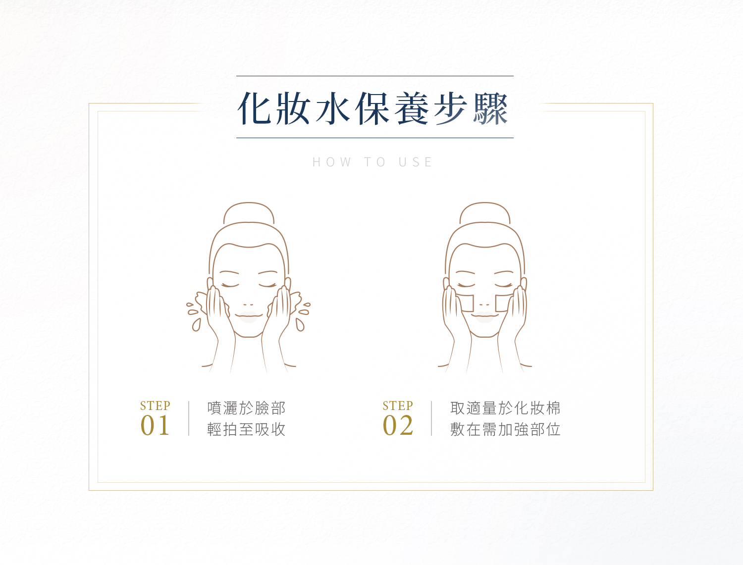 每天早晚清潔臉部後,均勻噴灑於全臉,不需等乾即可進行後續步驟。