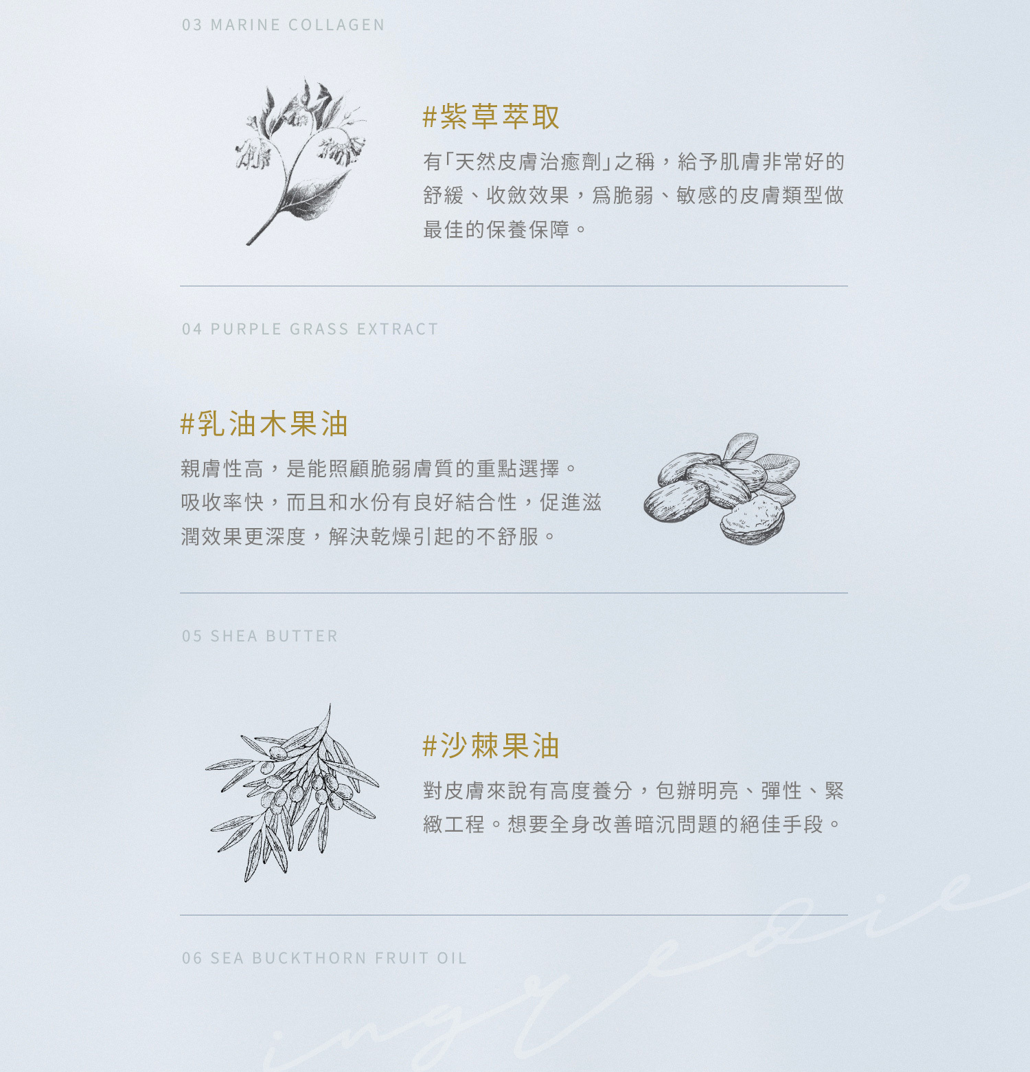 沙棘果油(Sea Buckthorn Berry Oil)、玫瑰精油、乳木果油、甘草萃取、紫草萃取、海洋膠原、櫻花萃取。