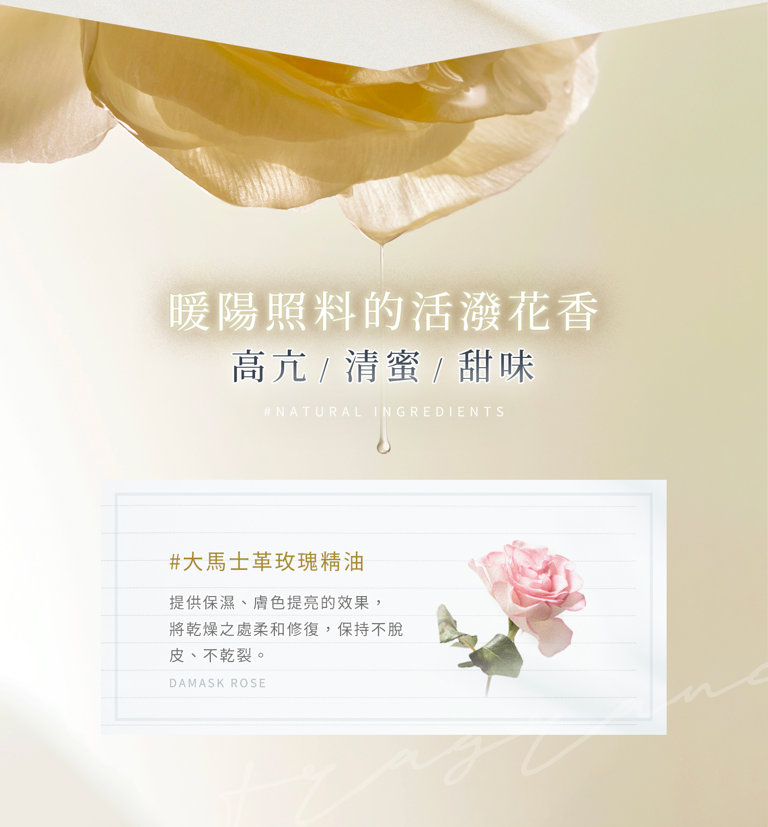 大馬士革玫瑰精油搭配沙棘果油,提亮膚色,締造美好香氛,讓枕邊丈夫不自覺越來越靠近妳。