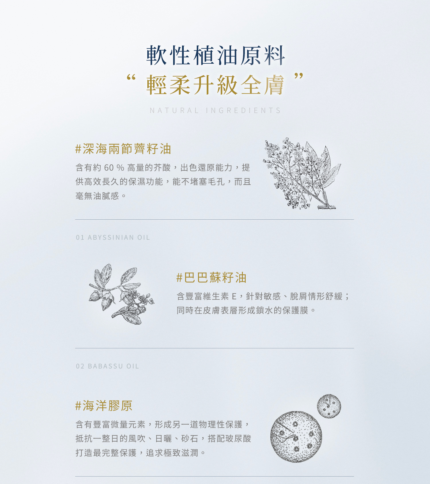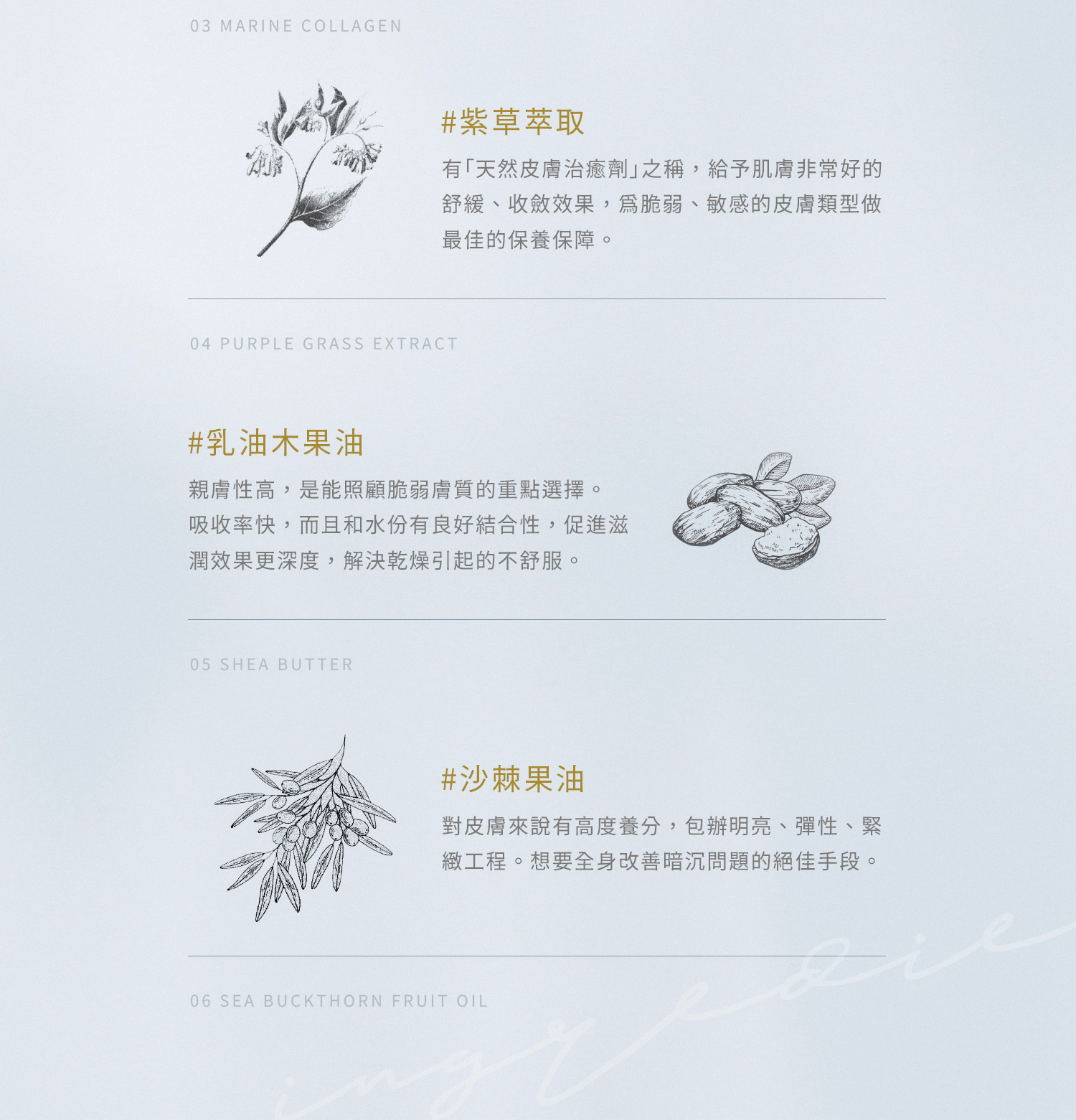 含有高濃度維他命 C、E,搭配沙棘果油可以深層滋養,杜絕乾燥肌膚。