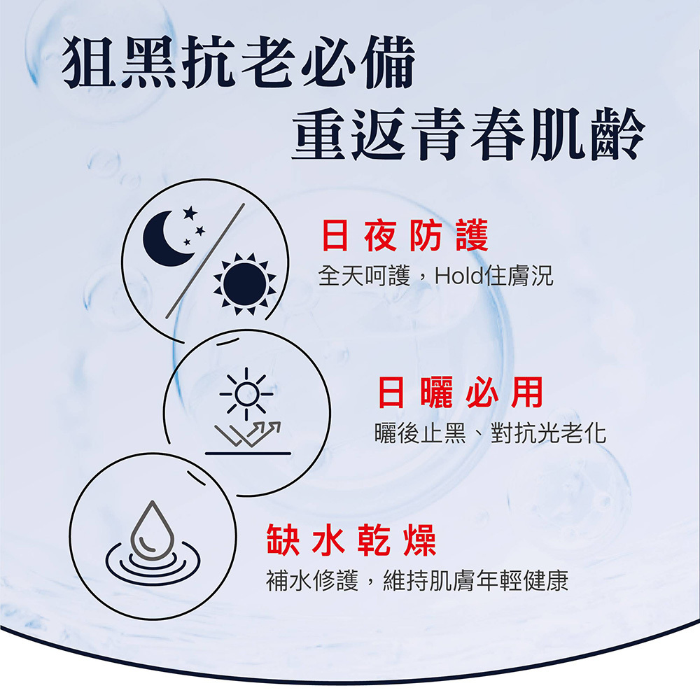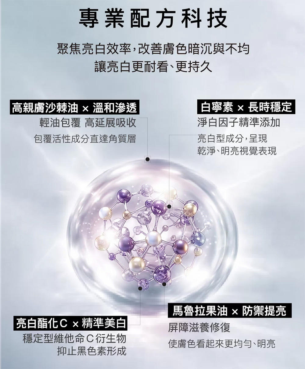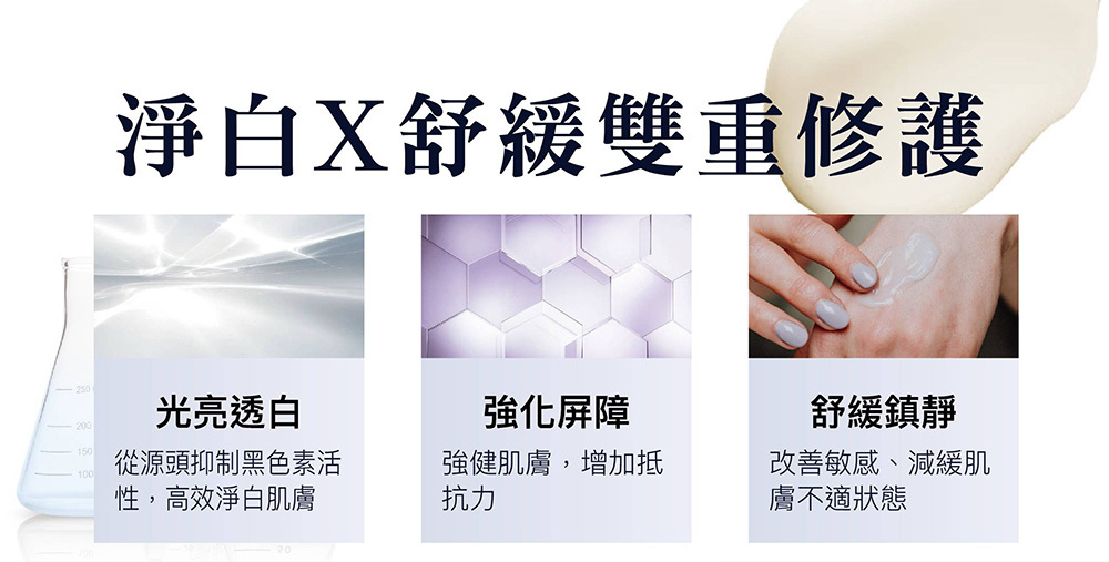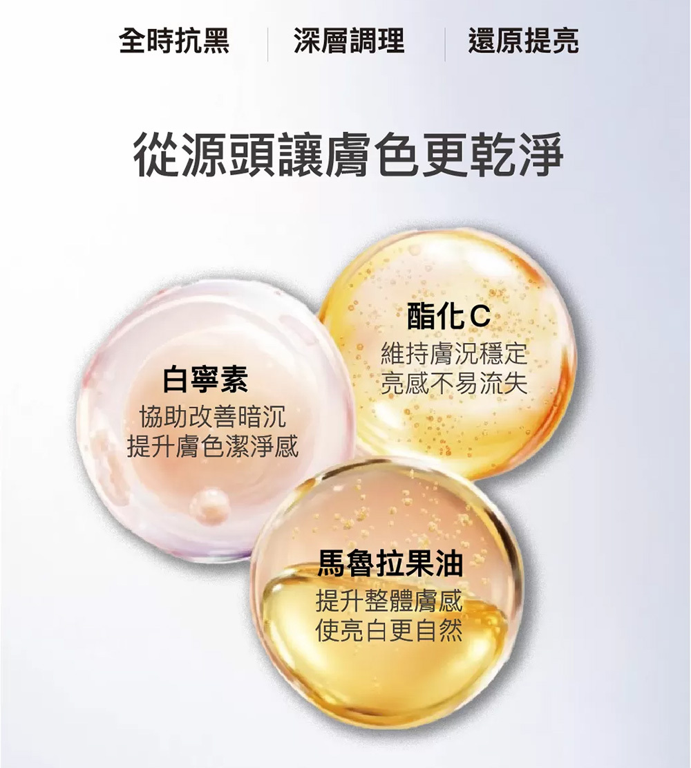 結合「穩定膚況」與「淡化暗沉」雙系統,同步建立肌膚防禦力,並針對已形成的膚色不均進行調理。