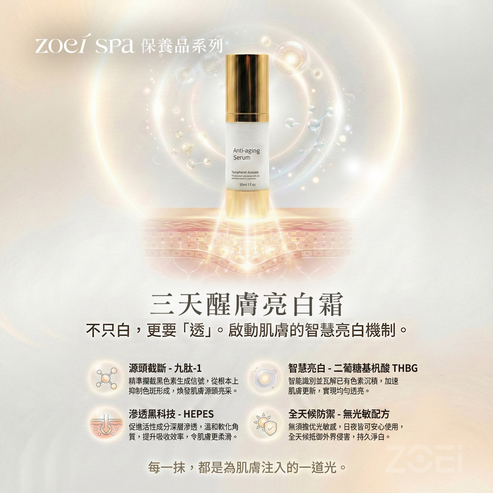 「三天醒膚亮白霜」重新定義了亮白邏輯,採用 「智慧生物轉化技術」 ,將美白與修護完美結合,由內而外層層把關。