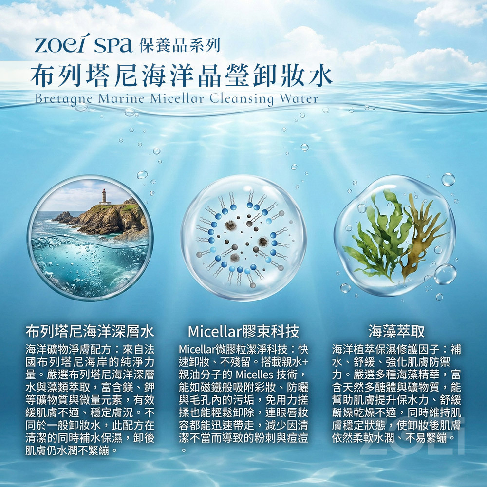 嚴選布列塔尼海洋深層水與藻類萃取,富含鎂、鉀等礦物質與微量元素,有效舒緩肌膚不適、穩定膚況。不同於一般卸妝水,此配方在清潔的同時補水保濕,卸妝後肌膚仍水潤不緊繃。