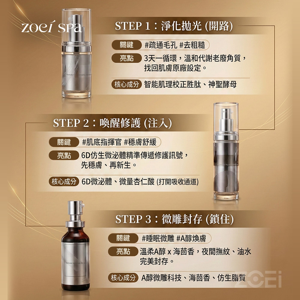 A醇 x 複合酸類: 透過A醇與酸類的黃金比例,進行溫和的「肌膚大掃除」。不僅能通暢堵塞毛孔,更能淡化歲月痕跡,讓肌膚看起來更緊緻、更年輕。