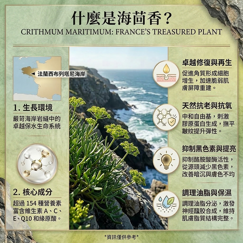市面上標榜海茴香的產品很多,但濃度敢加到 20% 的微乎其微。 我們不惜成本,將法國國寶級「綠鑽石」海茴香幹細胞灌注全系列,專為屏障受損、暗沉、初老的肌膚設計。這不是基礎保養,這是一場深度的肌膚重生工程。