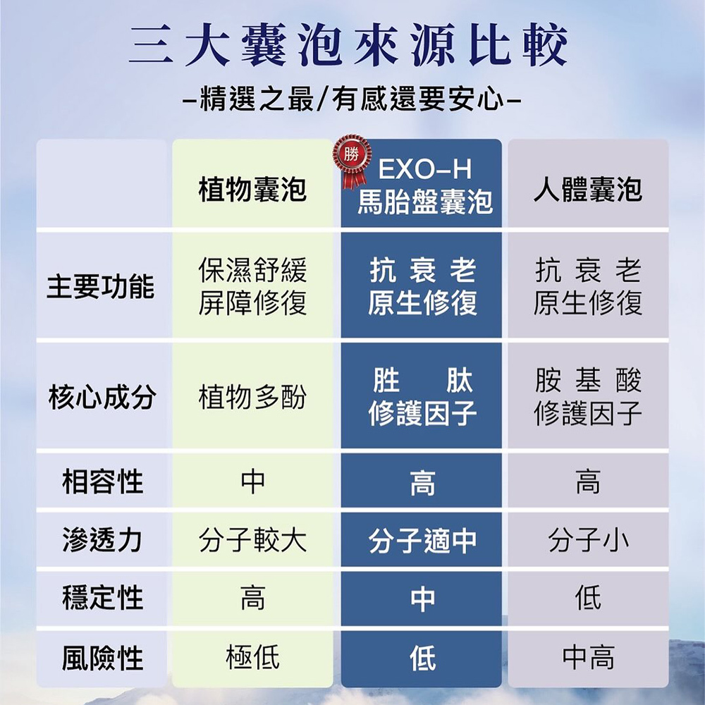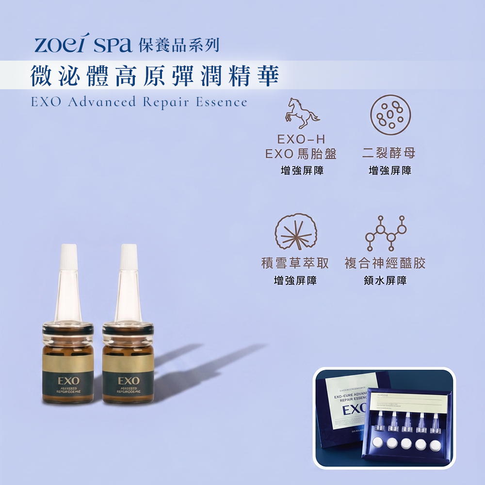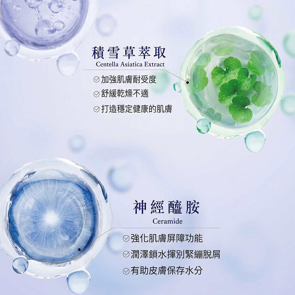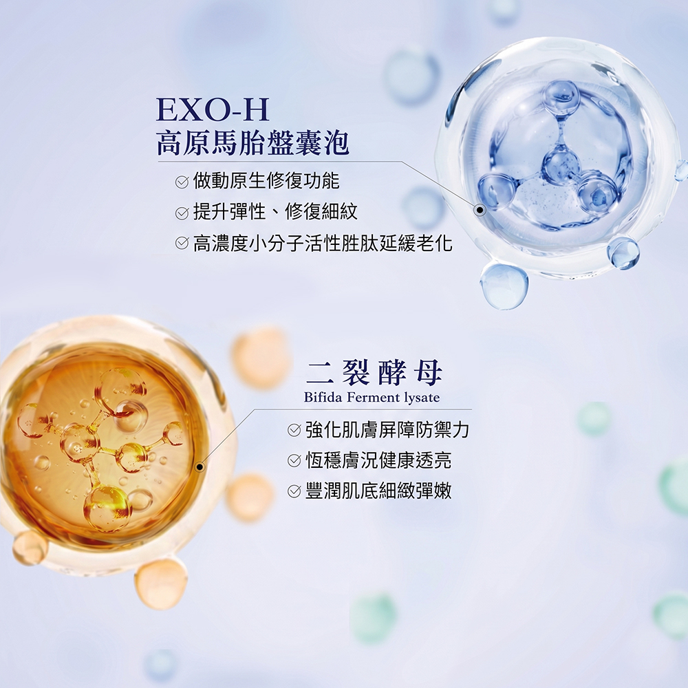 馬胎盤分子萃取(EXO)、 二裂酵母發酵產物、 積雪草萃取、 神經醯胺
