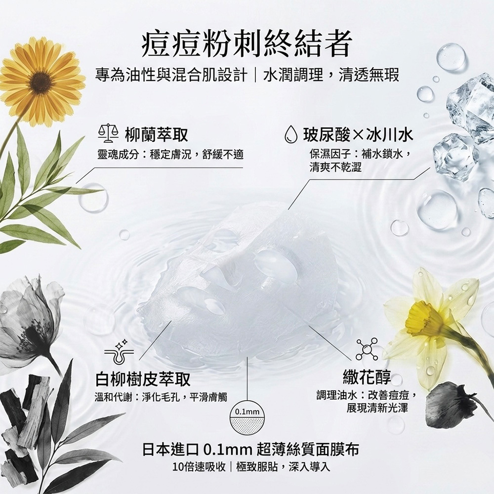 搭配玻尿酸與冰川水等保濕因子,敷後肌膚感受水潤柔嫩、不乾不緊繃,適合作為日常肌膚調理保養使用。