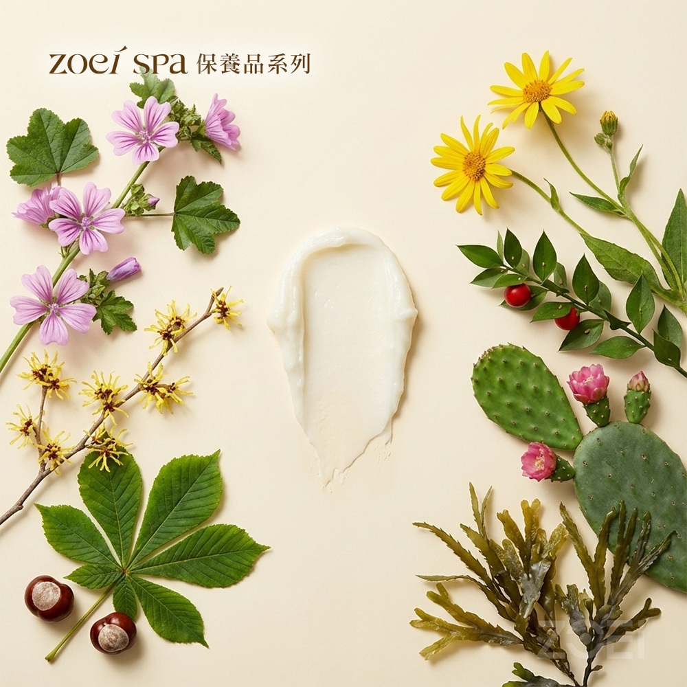 橙花精油、歐錦葵萃取、七葉樹籽萃取、金縷梅葉萃取、假葉樹根萃取、山金車花萃取、仙人掌花萃取、海藻萃取、葉綠素、山梨糖醇。