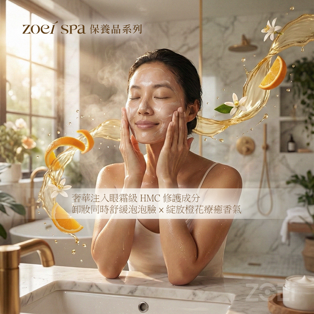 特別添加 HMC (橙皮植萃精華),這通常是眼霜級的保養成分,我們奢侈地加入卸妝乳中,幫助舒緩肌膚壓力、改善泡泡臉。