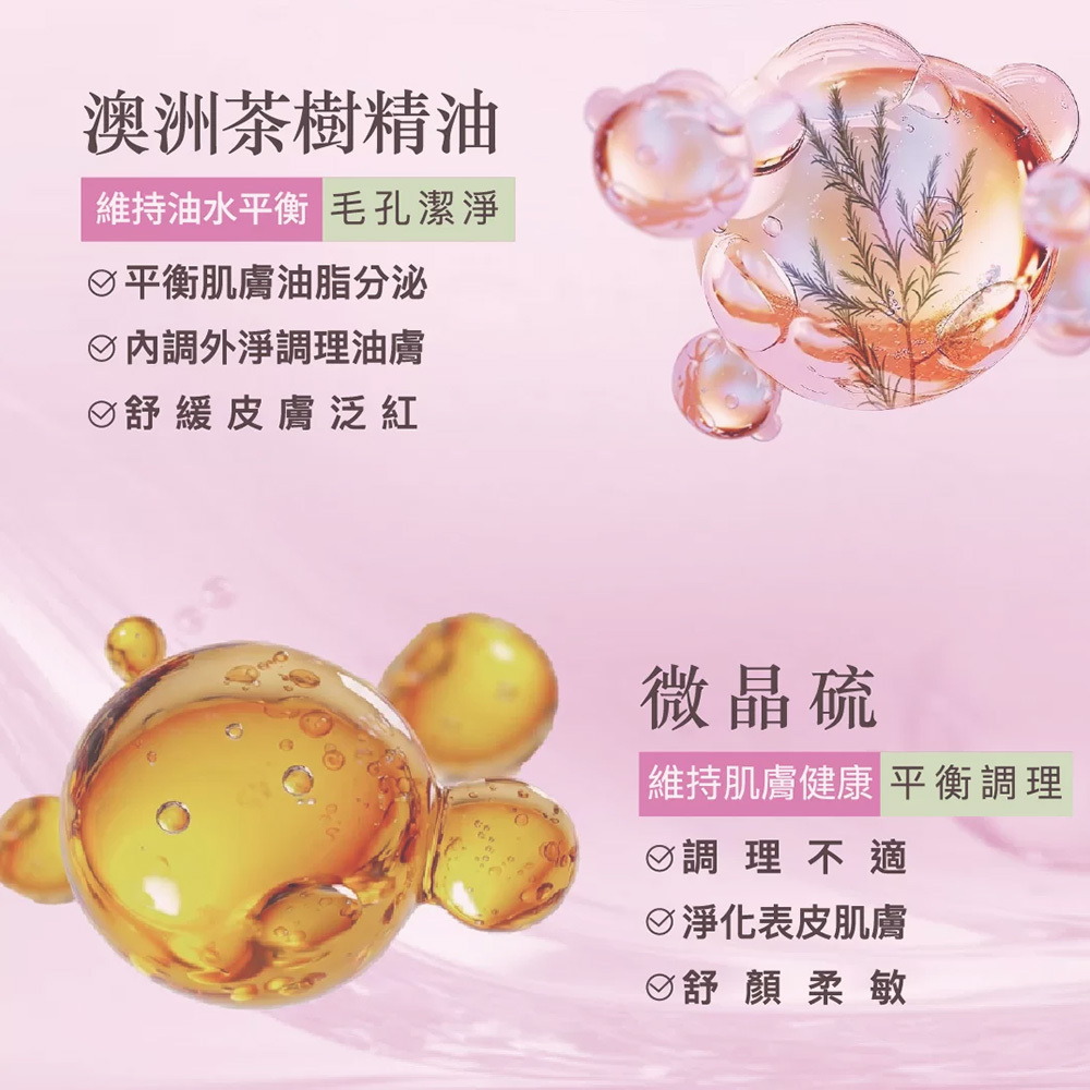 澳洲茶樹精油, 微晶硫, 甘草酸鉀, 神經醯胺, 泛醇。