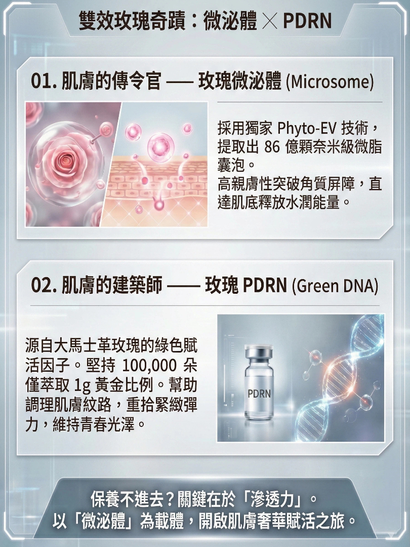 添加「大馬士革玫瑰外泌體」與「PDRN」、「玻尿酸」等多重修護保濕成分,有效提升肌膚防禦力,強化肌底結構,使肌膚柔嫩、彈潤、穩定修復、淡化細紋,達到極佳的保濕與修護效果。