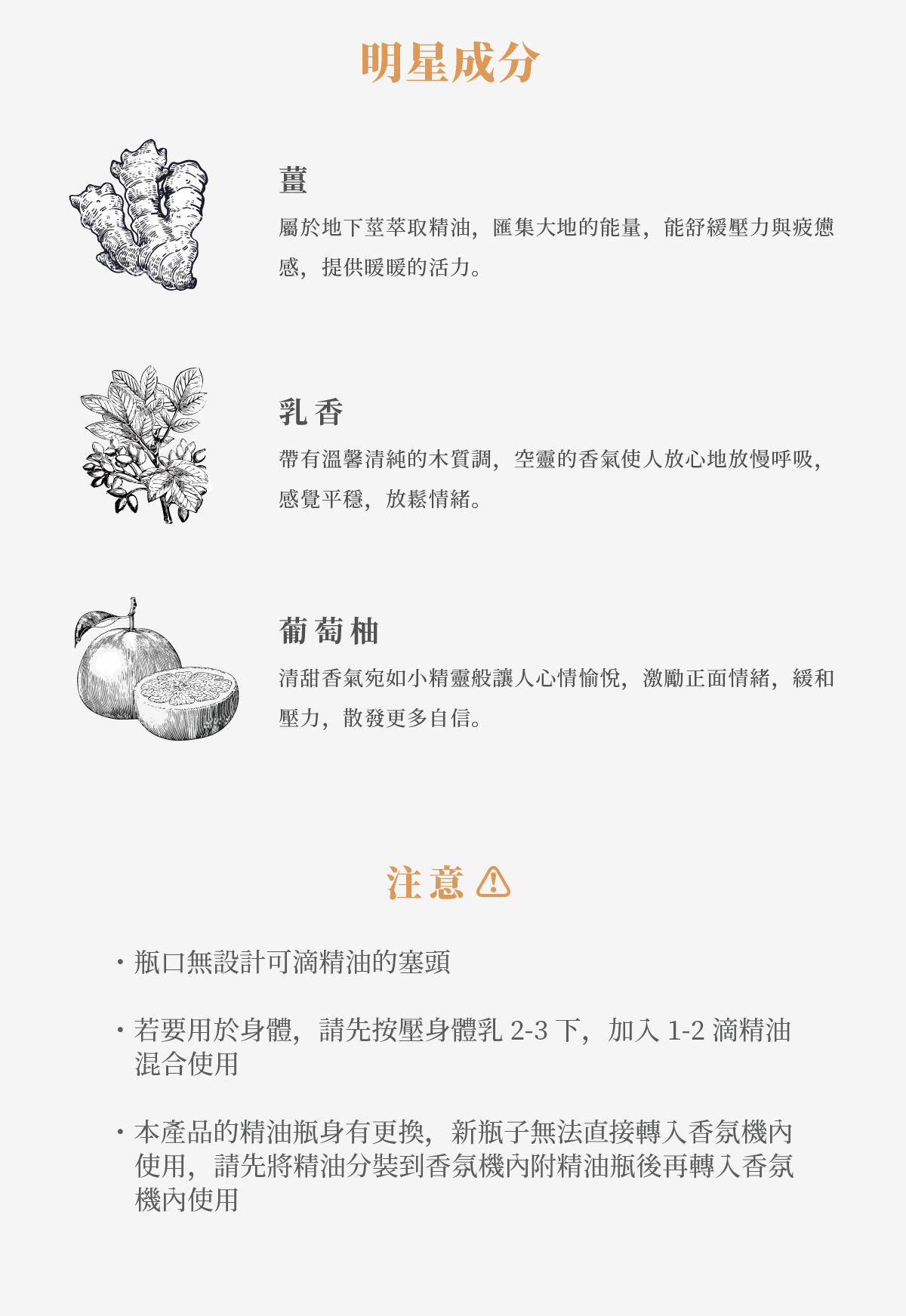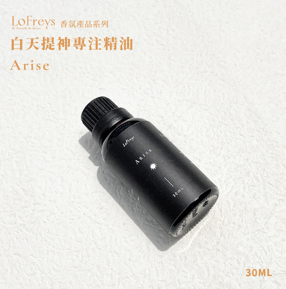 LoFreys 洛妃思 白天提神專注精油提供純粹紓壓、放鬆的天然體驗,可以使用在香氛機、身體按摩上,原料內含薑、乳香以及葡萄柚,平穩情緒後也感受大地般的暖暖能量。