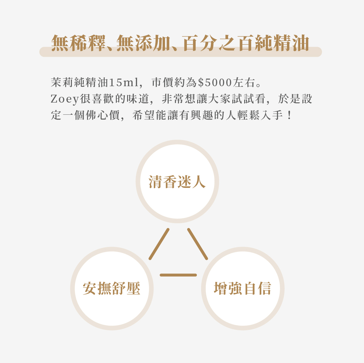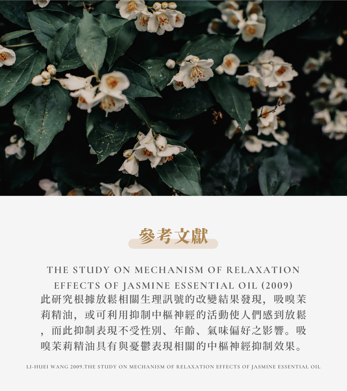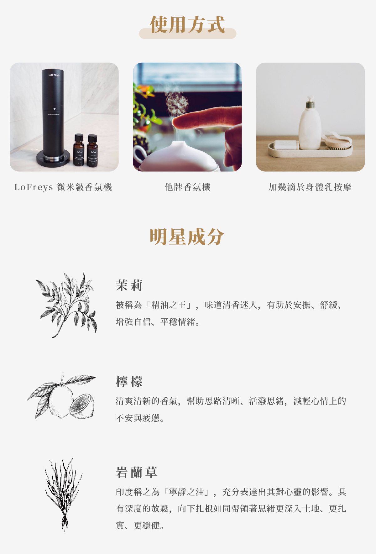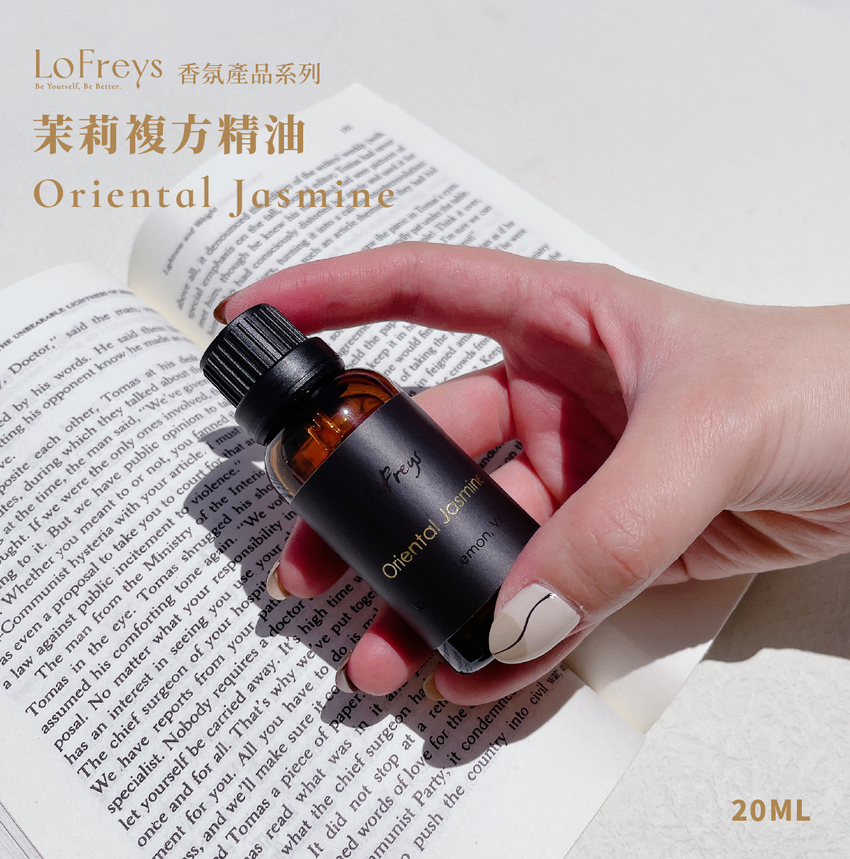 LoFreys 洛妃思 茉莉複方精油以茉莉、檸檬、岩蘭草調製,提供安撫情緒的清香,補充自信的感覺。可使用於香氛機,或者與乳液混和一滴擦拭。